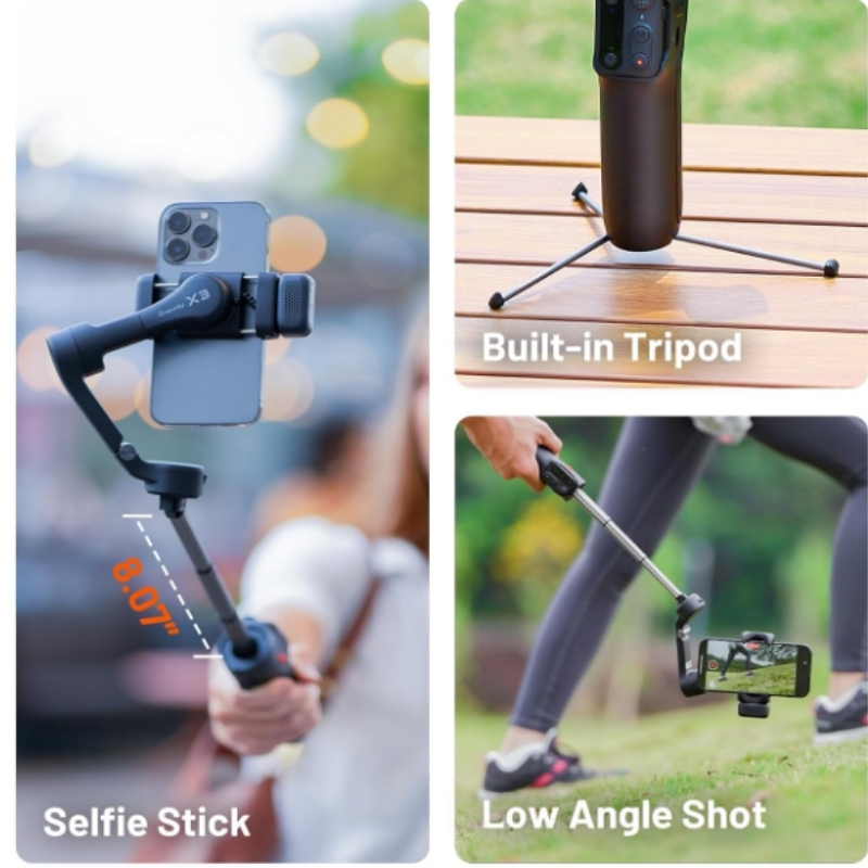 ULTRA-STEADY AND SMOOTH:Equipped with the latest 8.0 anti-shake system, the gimbal stabilizer ensures shake-free footage even during fast movements, accurately seizing those fleeting instants to take your creations to the next level; Extended roll arm ensures unobstructed views; Double-tap the power button to enter standby mode to save power or pick up the phone while in use.