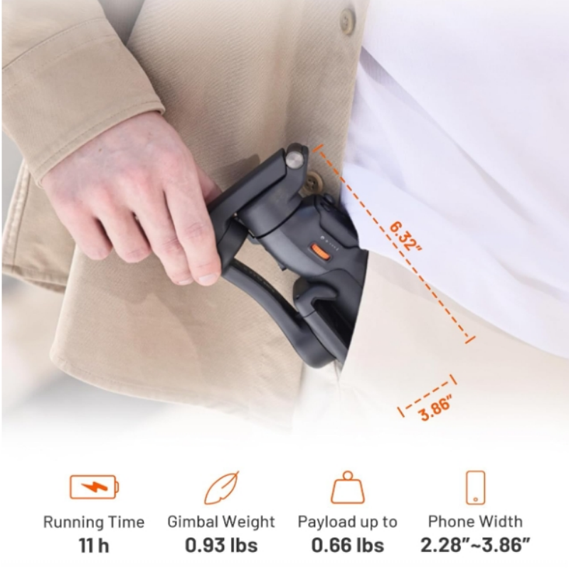 GIMBAL ON-THE-GO:Payload: 300 g; Foldable and compact, the pocket-sized design makes it easy to carry the phone stabilizer around and be ready to shoot at any time; A built-in extension rod and tripod expand the field of view, allowing you to unlock high and low-angle shots easily; Fully charged in 2 h, hassle-less shooting all day long.