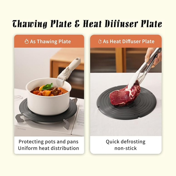 MULTIFUNCTIONAL PLATE - the non-slip texture design of the heat diffuser, the double-sided anti-slip protection of the pot reduces and distributes heat evenly. It eliminates hot spots in the pan and prevents food from burning. Defrosting trays can speed up the defrosting process, defrost quickly, keep food fresh and save a lot of time. It also protects the pan from blackening, so your pans will last as long as new, not unsightly.