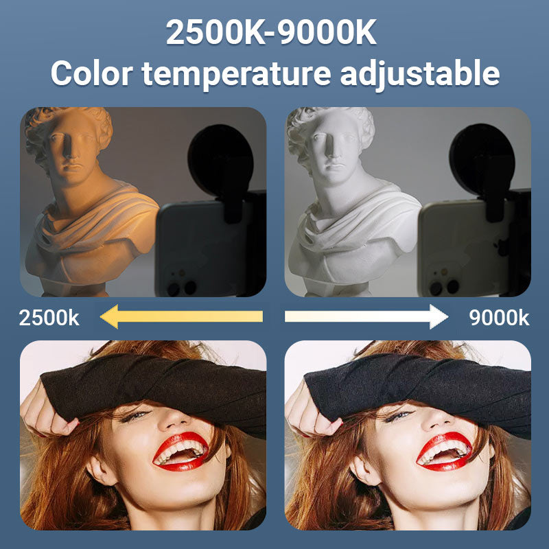 ▶【Prem-ium Light】 Adopting 36 pieces energy-saving LED beads (18 Yellow+18 White), this mini selfie light is adjustable in both brightness (1-4 steps) and 3 light modes of color temperature (2500 - 9000k). The illuminance range can reach 200K. It ensures all your shots perfectly lit.